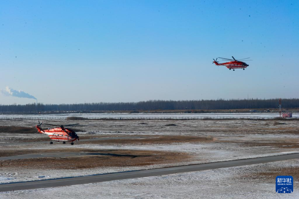 1月29日,在空投实战化训练现场,救援直升机陆续完成空投作业后返回。新华社发(闫安童摄)