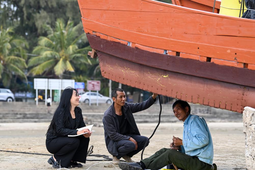 2月7日,在广西东兴市,全国政协委员苏海珍(左)与当地渔民交流。新华社记者 曹祎铭 摄