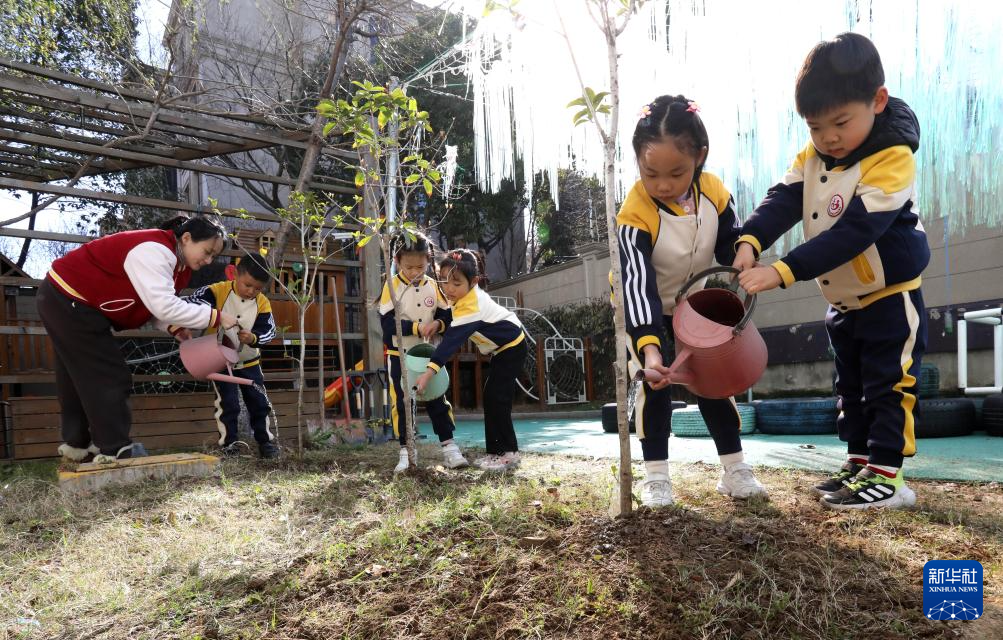 3月10日,在江苏苏州高新区实验幼儿园,孩子们和老师一起给刚栽种的树苗浇水。