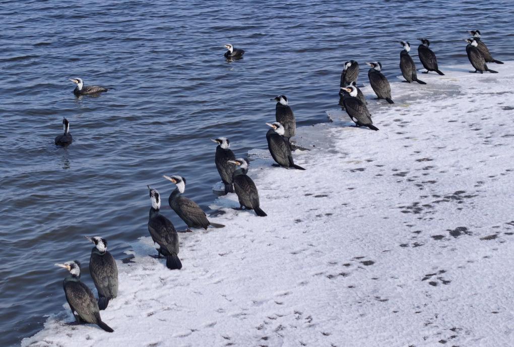3月11日,在松花江哈尔滨段,鸬鹚在休息、觅食。新华社发(杨威摄)