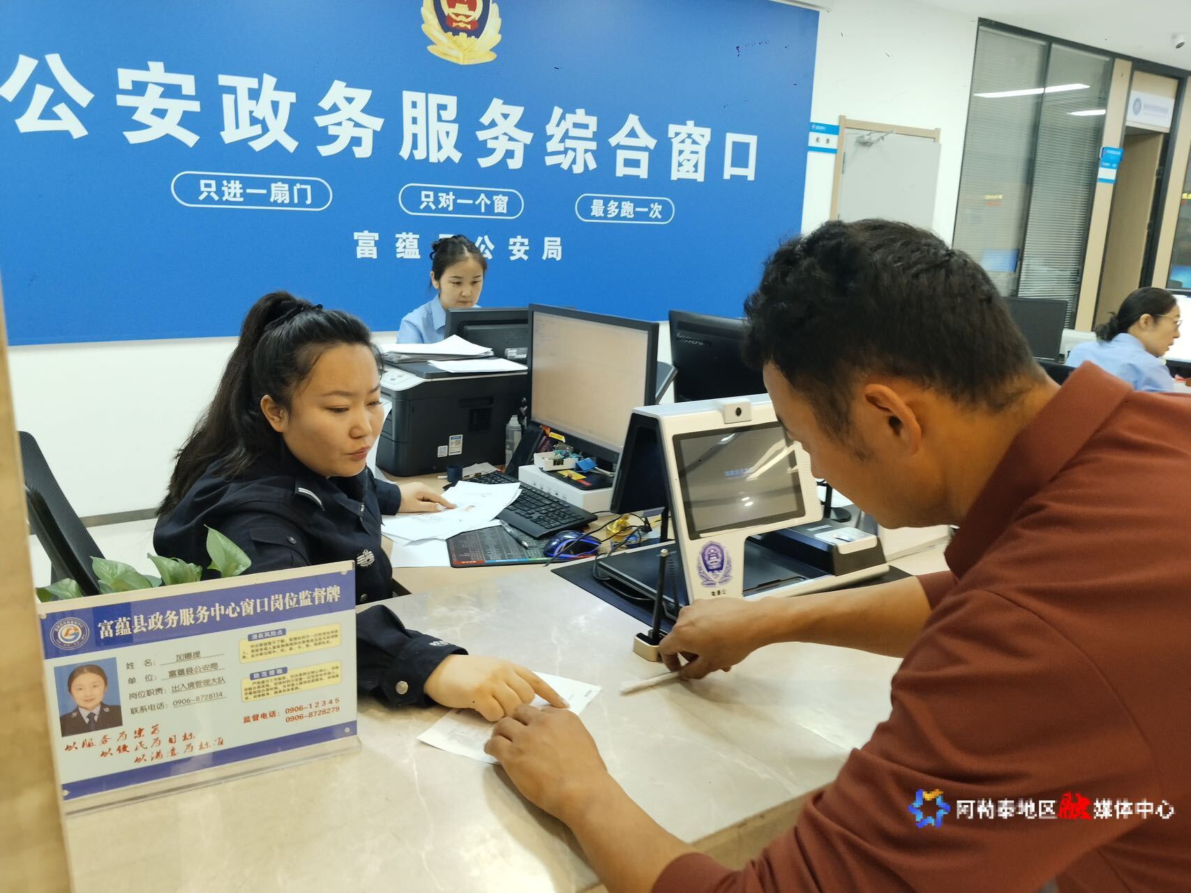 富蕴县公安局出入境窗口工作人员为群众办理业务。
