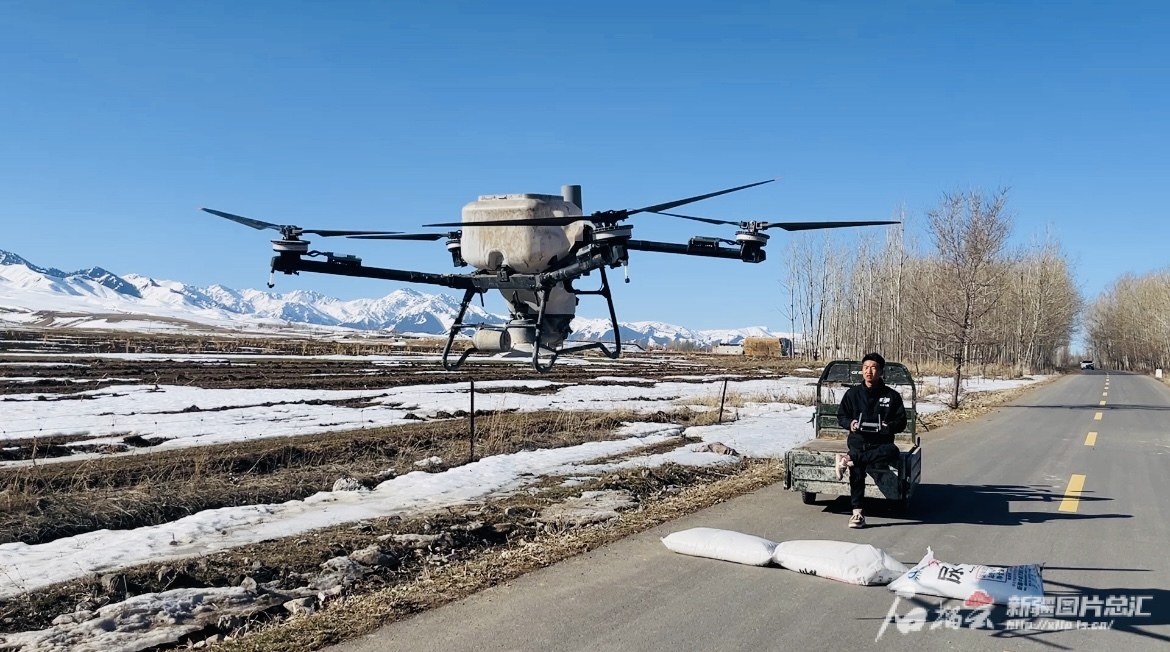 察布查尔锡伯自治县琼博拉镇克其克博拉村种植大户丁永占看着无人机操作员操控着农业无人机,“用上新农机,一个小时能作业100多亩。”