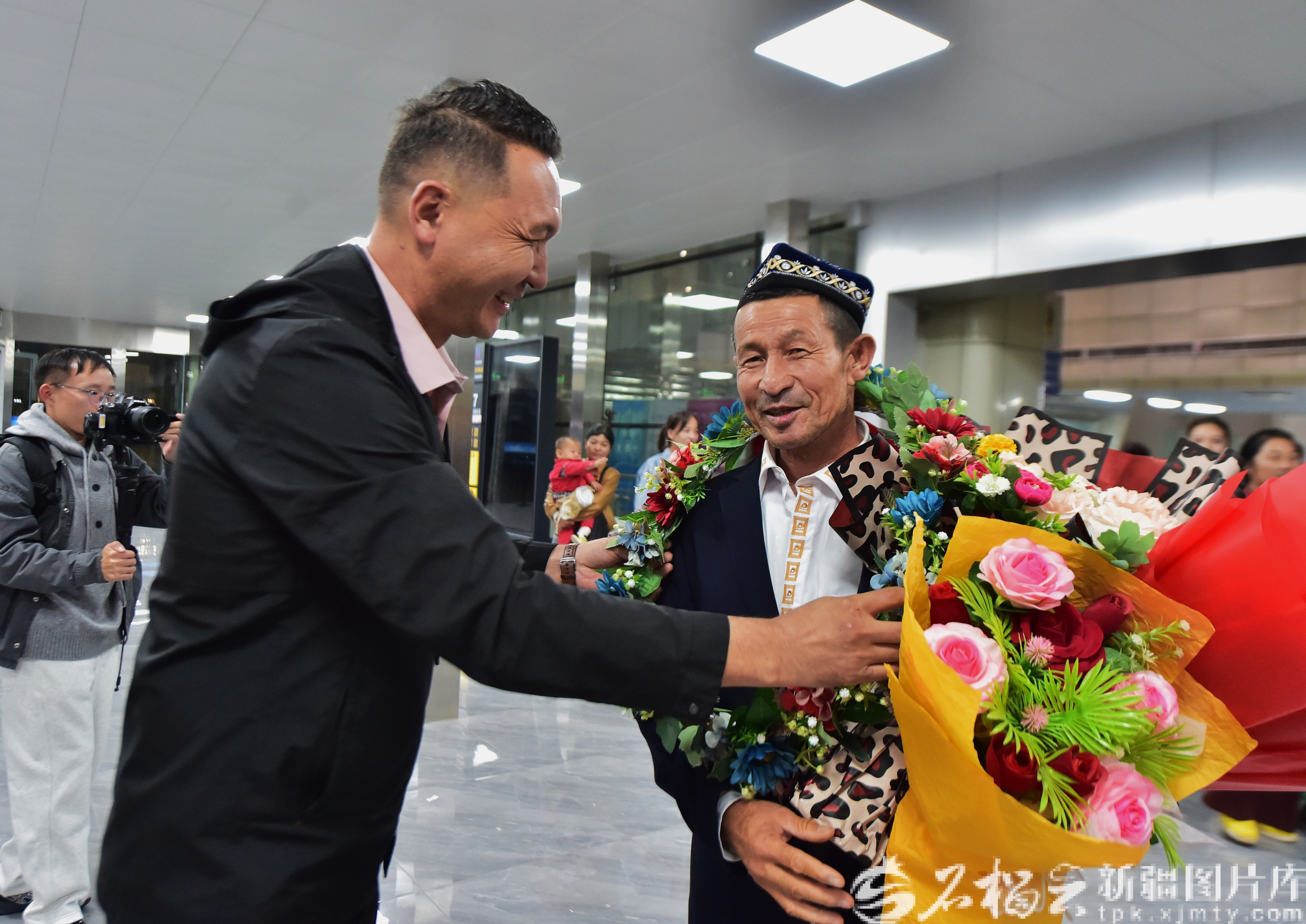 10月1日晚,阿力甫·买买提在机场和乡亲们合影。