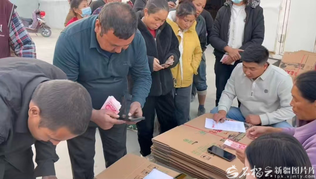 12月12日,墨玉县农业产业园内,在日光大棚建设工地打工的当地农民,正在领工资。闫永艾琳摄